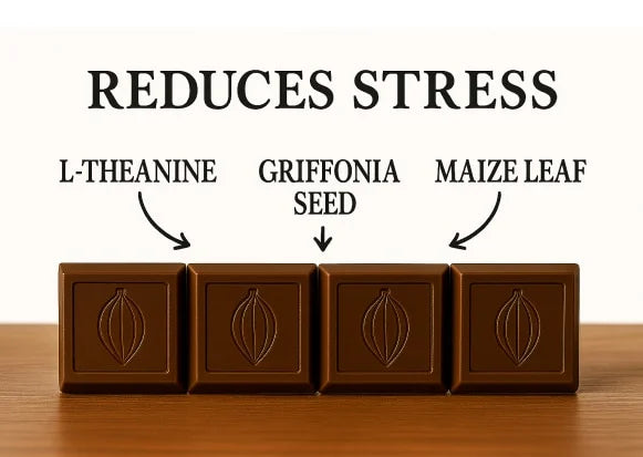 Stress Chocolate is a science-backed dark chocolate infused with a proprietary blend of all-natural ingredients designed to support your gut–heart–brain axis — the system that regulates how your body responds to stress.